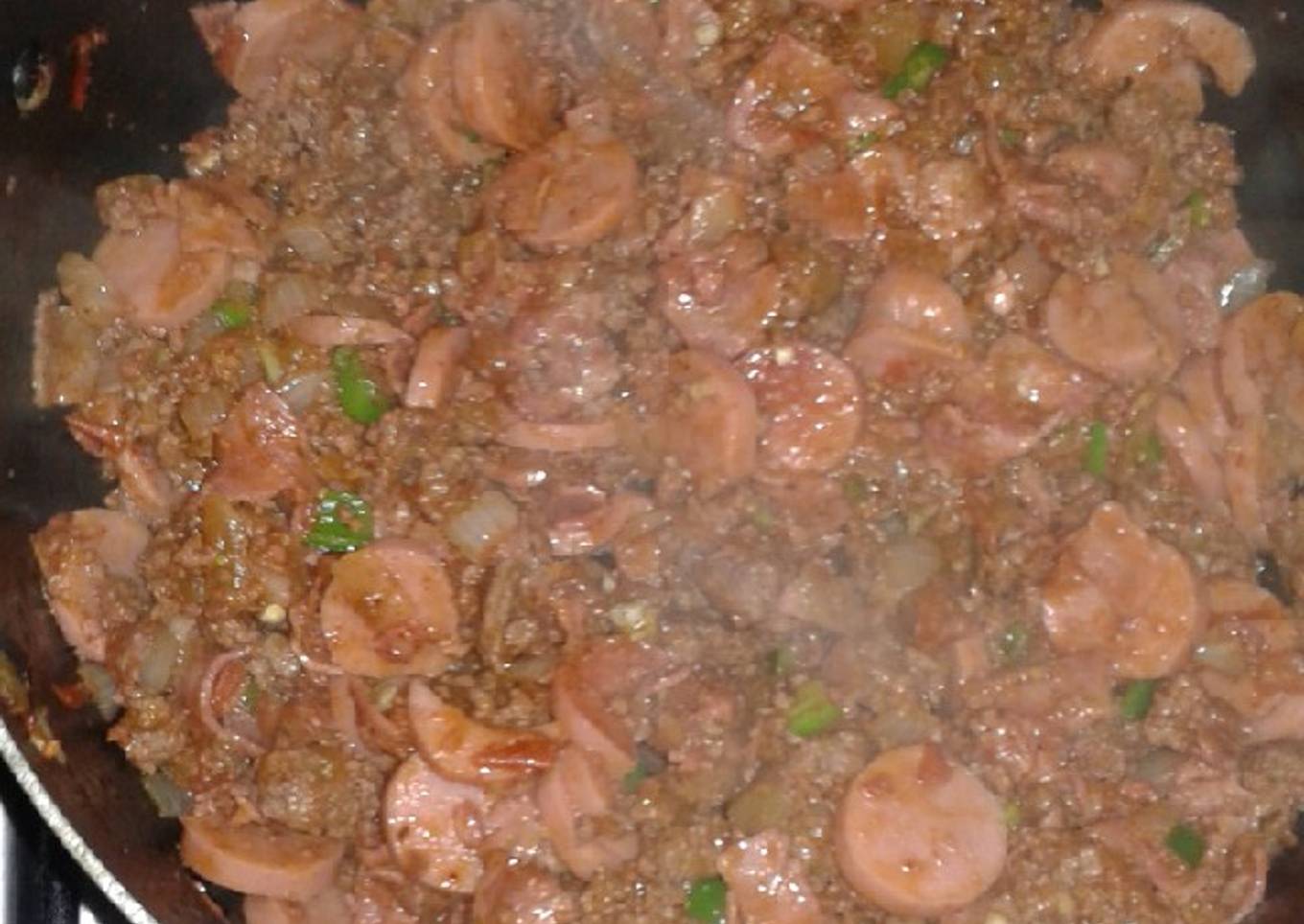 - En una cacerola grande se vierte el aceite, cuando ya esté caliente se le agrega el tocino, el chorizo y las salchichas. Luego que ya esté bien sazonado se reserva en un utensilio.