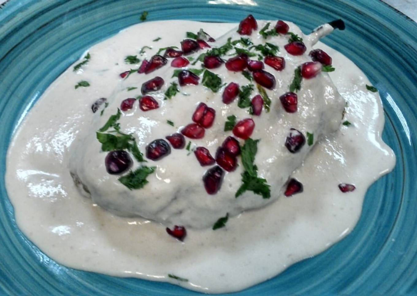 - Rellenar los chiles con el relleno de carne y frutas, bañar los chiles en el capeado y freír de inmediato; servir la nogada bañando el chile y adornar con perejil y granada.