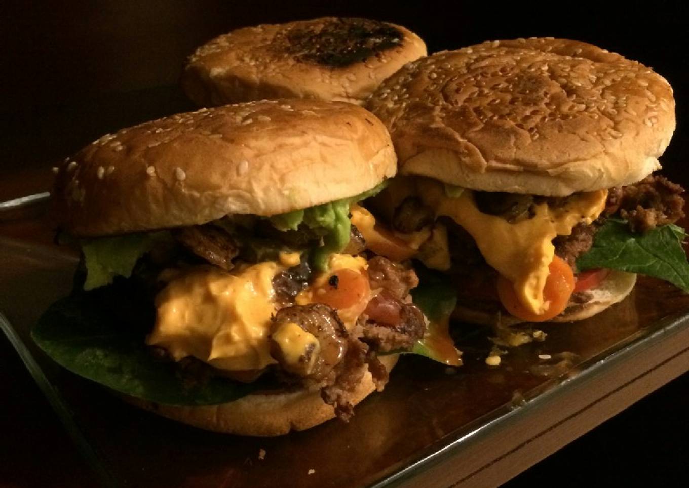- A la base del pan ponerle mayonesa, lechuga, espinaca, tomate y a la tapa mostaza y aguacate (dorar la carne para hamburguesa) (mezclar el queso amarillo con el caldo de chipotle)