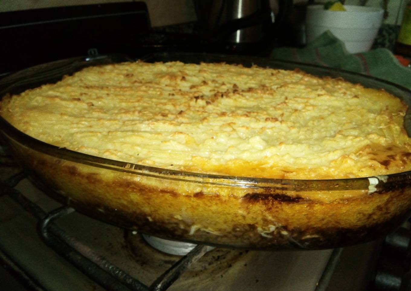 - En una fuente apta para el horno, se pone un poco de puré en la base, se vuelca todo el relleno, se empareja y se tapa con el resto del puré. Se marca con el tenedor, se lleva al horno hasta que dore.