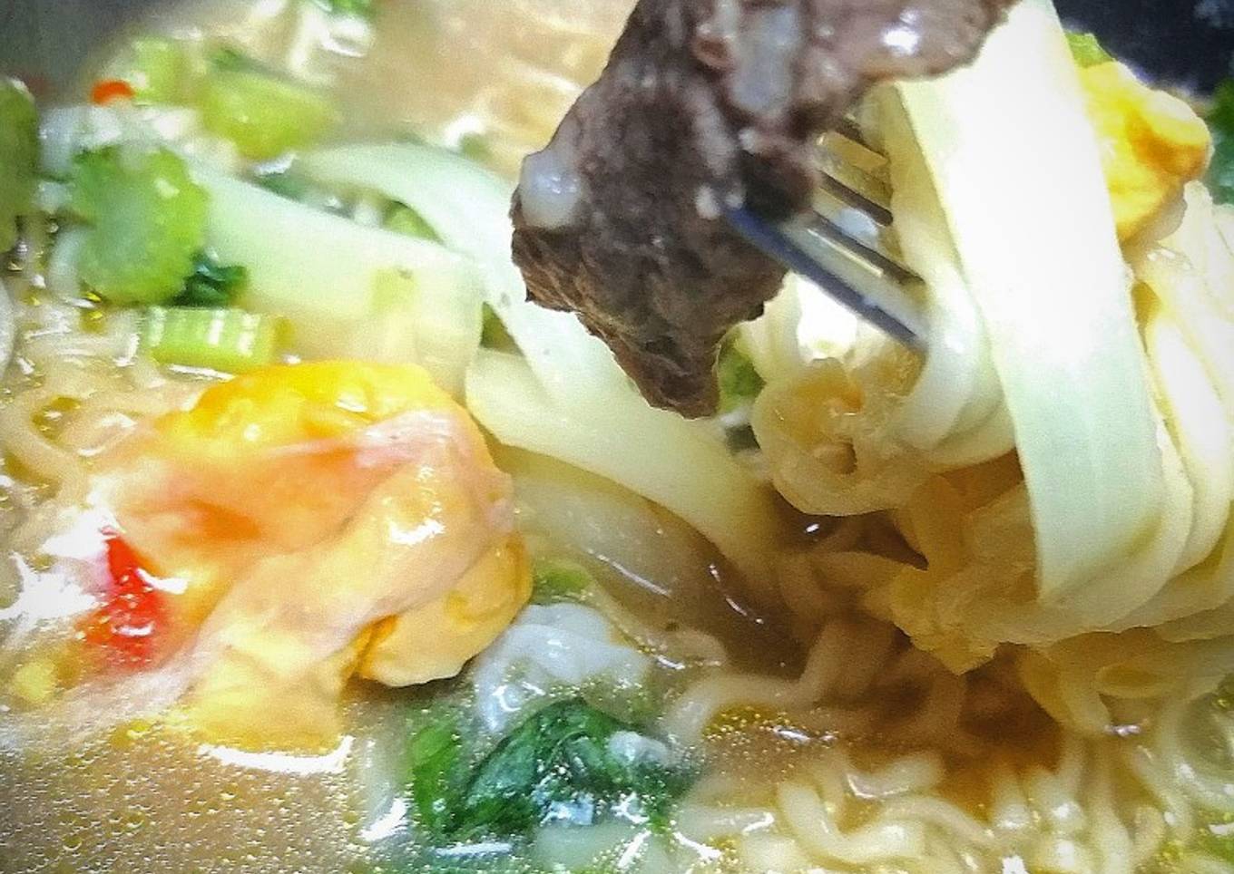 - En una olla, salteamos carne, ajos, jengibre y cebollas, hasta que la carne este a medio cocción. Retiramos solo la carne y reservamos para el final. Continuamos con el caldo y agregamos el resto de las especias, dejamos que hierva suavemente por 3 minutos, agregamos el huevo y cocemos 2 minutos.