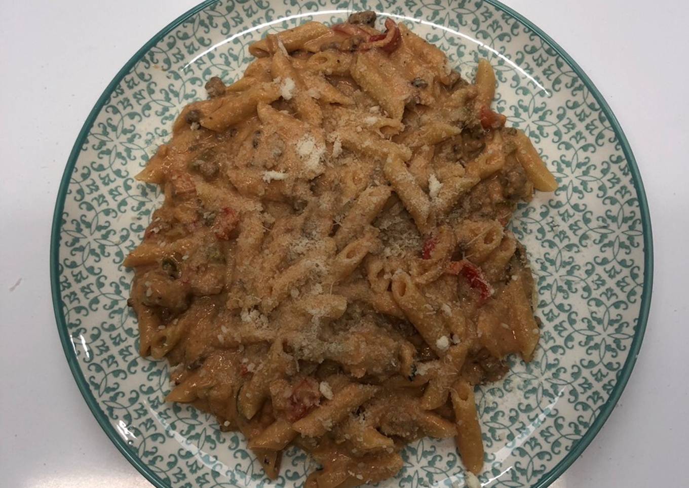 Macarrones con carne picada, tomate, nata, parmesano y verduras