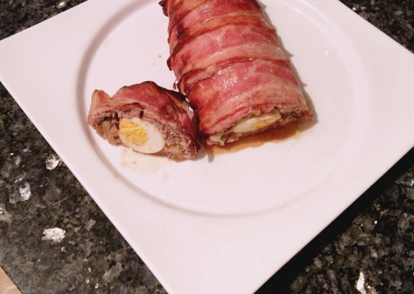 - Ponemos el rollo de carne encima y volvemos a enrollar con el bacon.
