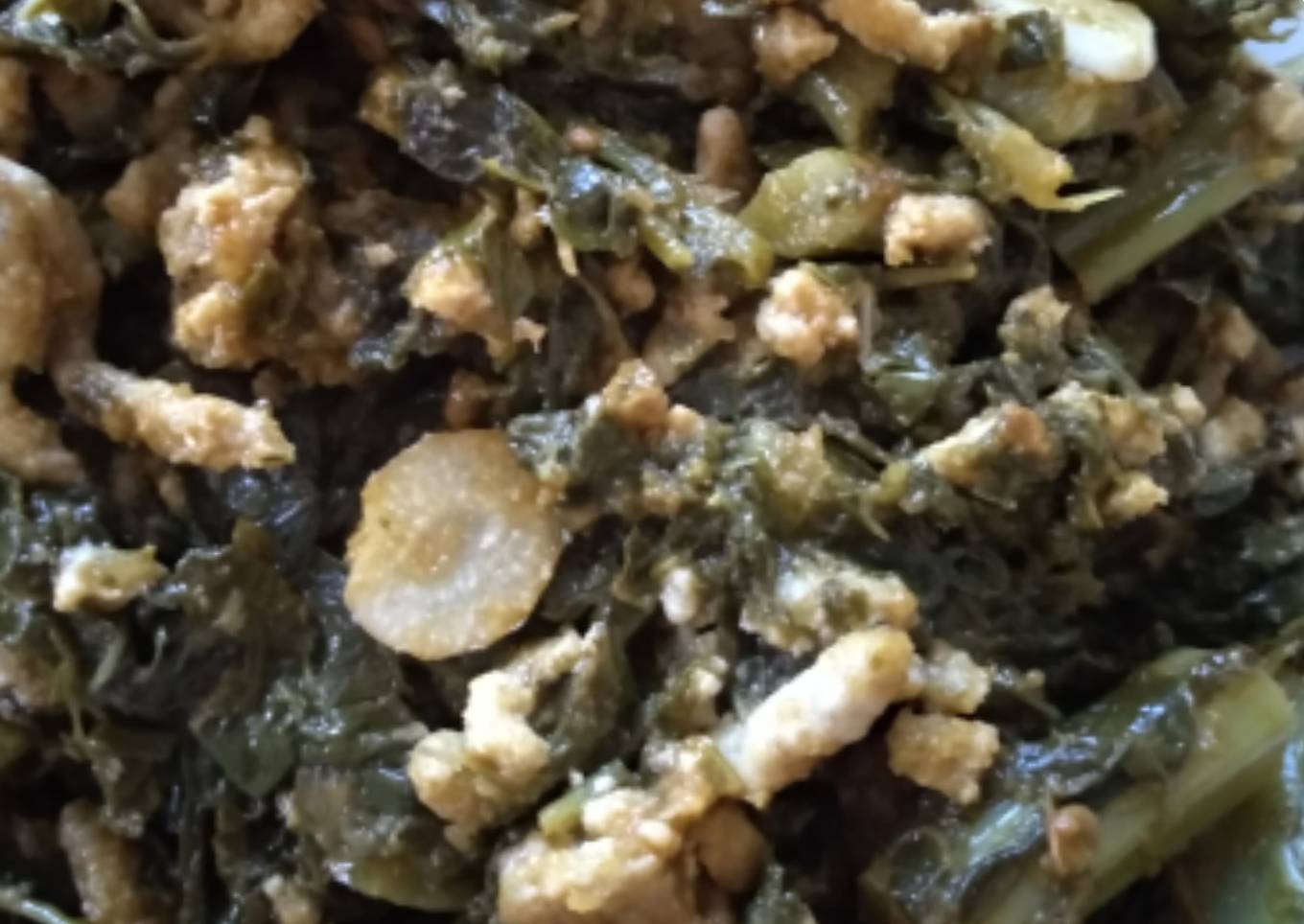 - En la sartén echar aceite, cuando está caliente echar los ajos, dar unas vueltas y echar la carne picada, lo vamos removiendo, cuando esté la carne, echar la berza que teníamos reservado y ya lo tenemos.
