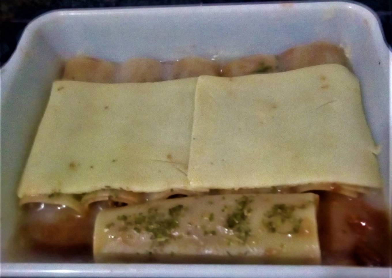 - En una refractaria añadir un poco de salsa napolitana y sobre ella disponer los canelones rellenos con la carne molida. Nota del 👩🍳Chef: Si NO tenemos los canelones que los venden YA!! listos, se puede utilizar las láminas de la lasaña calentando agua caliente para hidratarlas y se puedan doblar fácilmente, se coloca la carne molida y se enrolla. Es fácil!! Mira la foto👀...