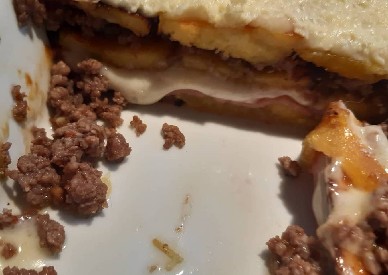 - Hacemos capitas de 1 maduro 2 jamón y queso 3 carne molida y así sucesivamente hasta terminar todos los ingredientes y dejar de ulimo una capa de maduro, por último rallamos queso y ponemos tajadas de queso crema